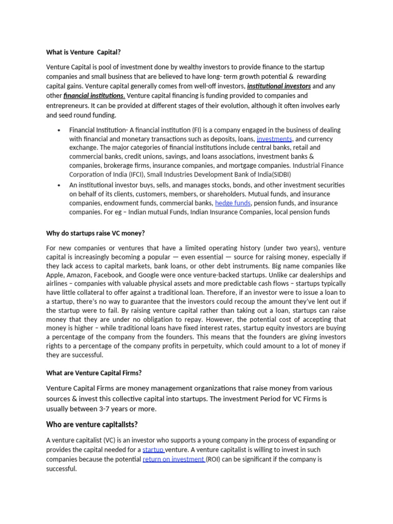 Venture Capital is pool of investment done by wealthy investors to provide finance to the startup