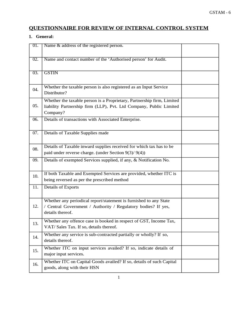QUESTIONNAIRE FOR REVIEW OF INTERNAL CONTROL SYSTEM
