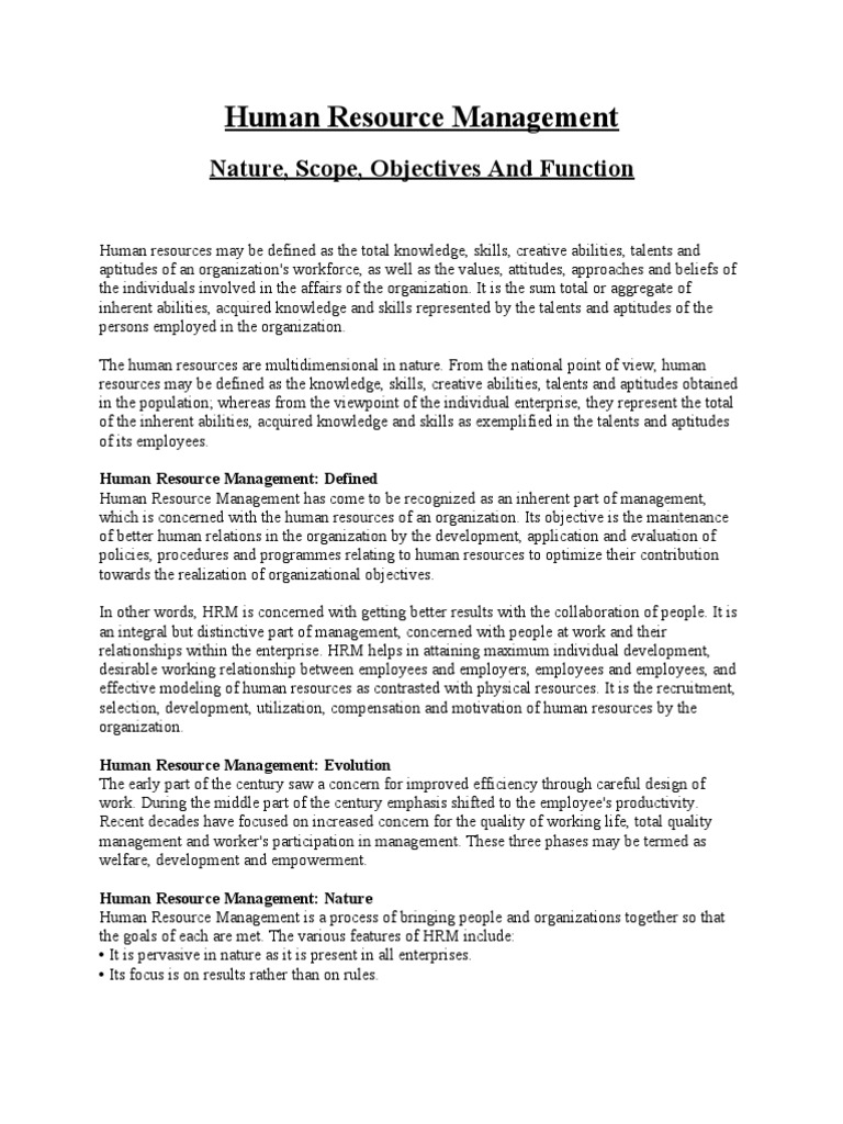 Human resources may be defined as the total knowledge, skills, creative abilities, talents and aptitudes of an organization's workforce, as well as the values, attitudes, approaches and beliefs of the individuals involved in the affairs of the organization. It is the sum total or aggregate of inherent abilities, acquired knowledge and skills represented by the talents and aptitudes of the persons employed in the organization. The human resources are multidimensional in nature. From the national point of view, human resources may be defined as the knowledge, skills, creative abilities, talents and aptitudes obtained in the population; whereas from the viewpoint of the individual enterprise, they represent the total of the inherent abilities, acquired knowledge and skills as exemplified in the talents and aptitudes of its employees. Human Resource Management: Defined Human Resource Management has come to be recognized as an inherent part of management, which is concerned with the human resources of an organization. Its objective is the maintenance of better human relations in the organization by the development, application and evaluation of policies, procedures and programmes relating to human resources to optimize their contribution towards the realization of organizational objectives. In other words, HRM is concerned with getting better results with the collaboration of people. It is an integral but distinctive part of management, concerned with people at work and their relationships within the enterprise. HRM helps in attaining maximum individual development, desirable working relationship between employees and employers, employees and employees, and effective modeling of human resources as contrasted with physical resources. It is the recruitment, selection, development, utilization, compensation and motivation of human resources by the organization. Human Resource Management: Evolution The early part of the century saw a concern for improved efficiency through careful design of work. During the middle part of the century emphasis shifted to the employee's productivity. Recent decades have focused on increased concern for the quality of working life, total quality management and worker's participation in management. These three phases may be termed as welfare, development and empowerment. Human Resource Management: Nature Human Resource Management is a process of bringing people and organizations together so that the goals of each are met. The various features of HRM include: It is pervasive in nature as it is present in all enterprises. Its focus is on results rather than on rules.