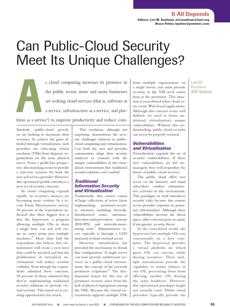 from multiple organizations on a single server, you must provide security at the VM level rather than at the perimeter. This situation is exacerbated when cloud users create Web-based applications. Although this concern seems well defined, we need to better understand virtualizations unique vulnerabilities. Without this understanding, public-cloud security can never be properly realized.