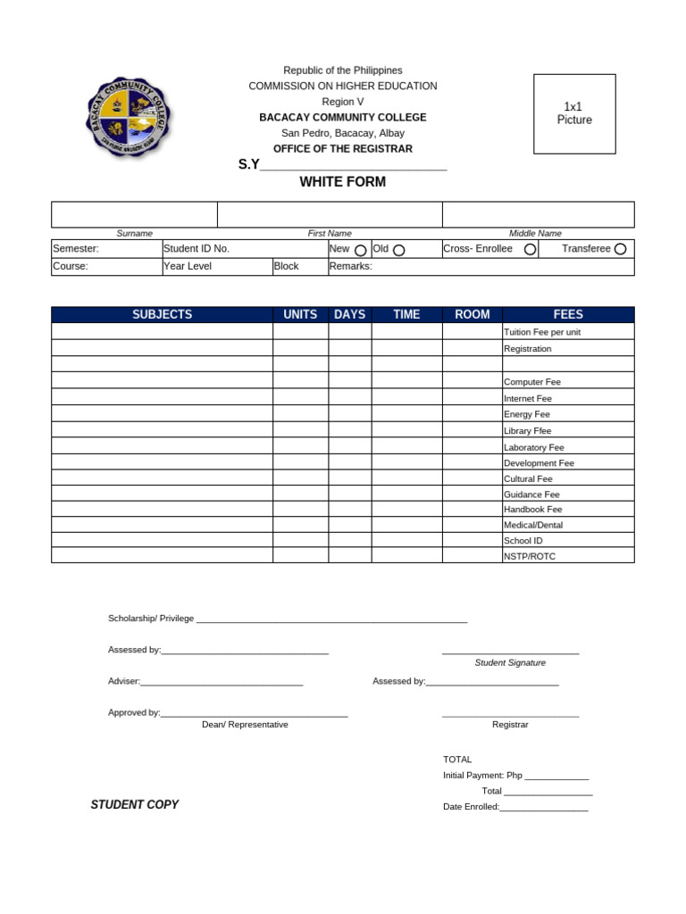 SUBJECTS UNITS DAYS TIME ROOM FEES