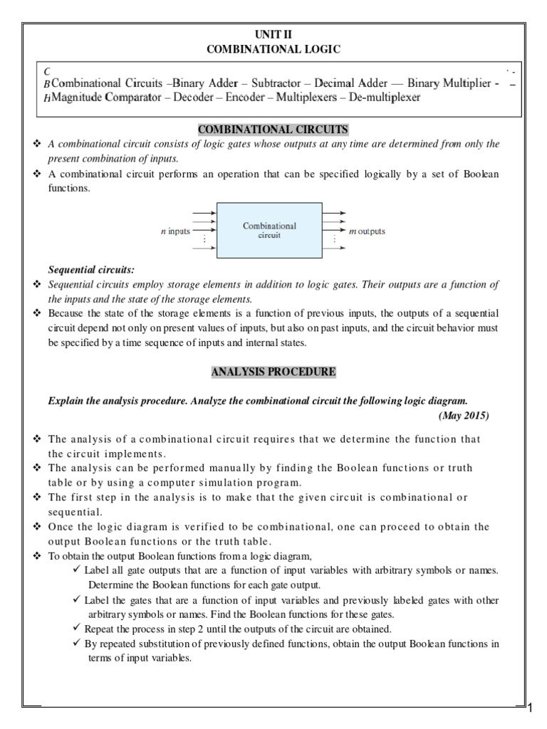 Combinational Circuits – Analysis and Design Procedures - Binary Adder- Subtractor -Decimal Adder -