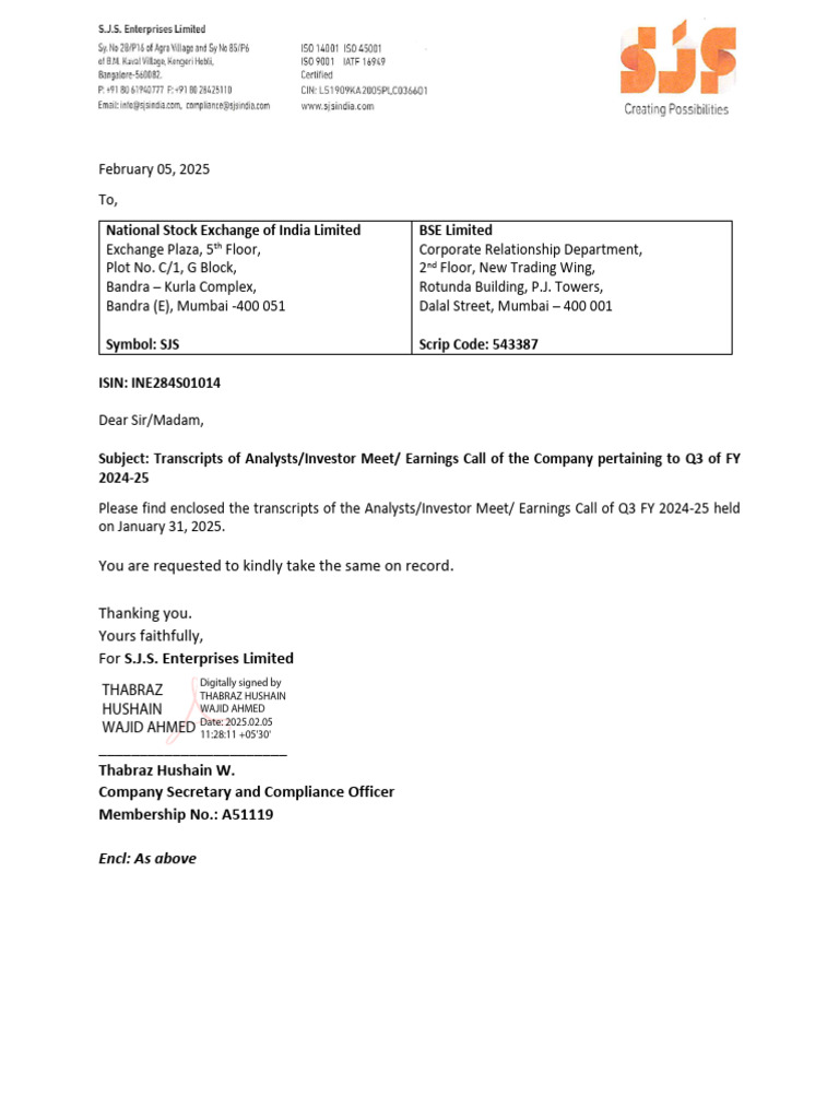 Moderator: Ladies and gentlemen, good day, and welcome to SJS Enterprises Limited Q3FY25 Earnings