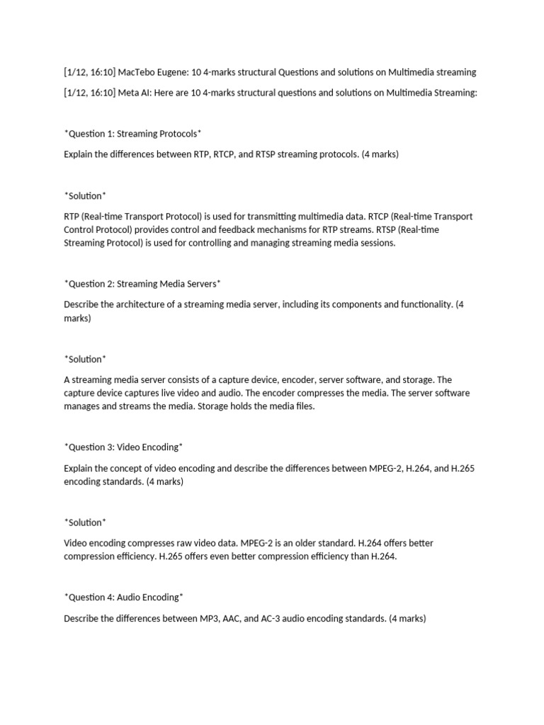 [1/12, 16:10] MacTebo Eugene: 10 4-marks structural Questions and solutions on Multimedia streaming