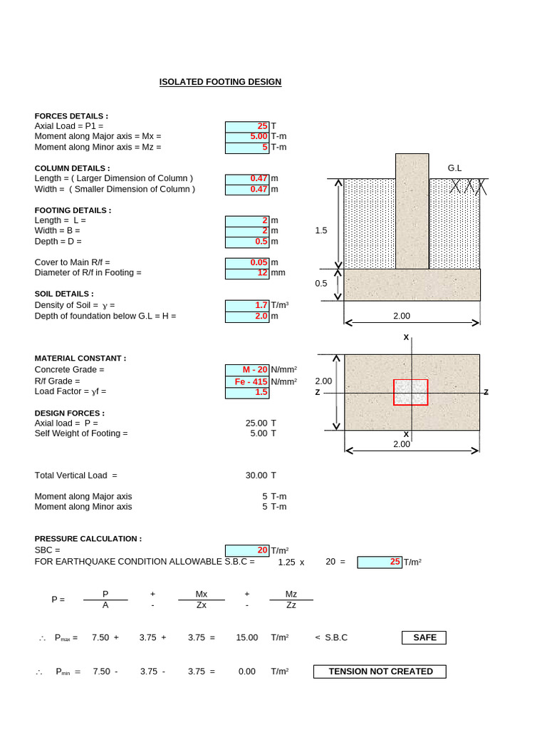 \ Pmax = 7.50 + 3.75 + 3.75 = 15.00 T/m2 < S.B.C SAFE