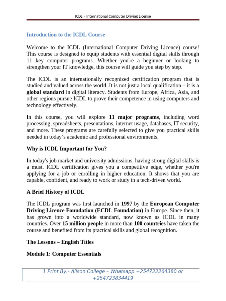 Welcome to the ICDL (International Computer Driving Licence) course!