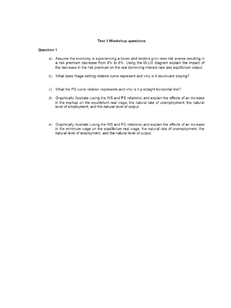 The document contains workshop questions related to economic concepts such as the impact of a decrease in risk premium on interest rates and equilibrium output, the wage-setting relation curve, and the price-setting curve. It also asks for graphical illustrations and explanations of the effects of an increase in markup and minimum wage on various economic indicators. The questions aim to assess understanding of IS-LM diagrams and labor market relations.