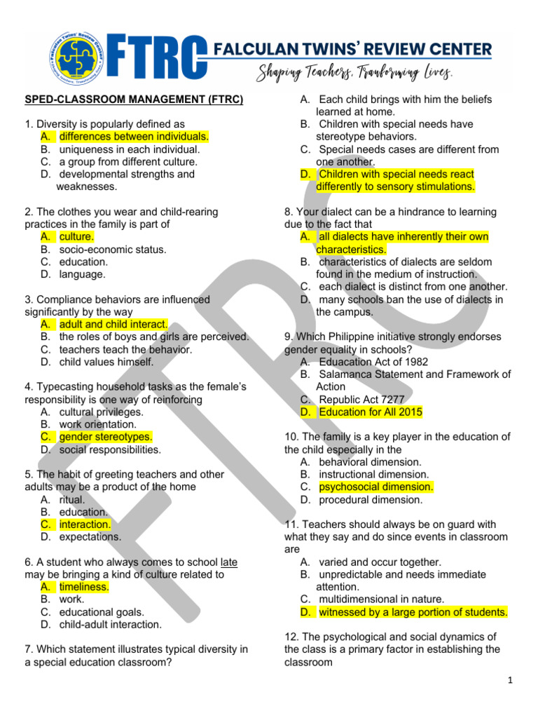 SPED-CLASSROOM MANAGEMENT (FTRC) A.