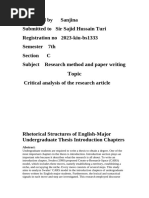 ing library research on American attitudes toward the elderly with interviews with residents and employees of local nursing homes; supplementing print sources dealing with public attitudes toward President Clinton and Monica Lewinsky with surveys of students and interviews with political science professors at my school; and in one memorable instance, supplementing published studies of bar culture and the effects of alcohol on male-female behavior with material based on field notes derived from the students observations in local bars on a series of Friday and Saturday nights over the month before the paper was due. Conclusion The students dont necessarily produce papers overwhelmingly superior to their previous essays and worthy of publication in a scholarly journal. But they do learn to view themselves as original researchers, creating new knowledge; they learn to evaluate previous researchers claims and test those claims applicability to their own world, thus approaching previously published works not as literally unquestionable authorities but as products of other rhetorical situations, an approach composition researchers have described as crucial to successful researchbased writing (Brent; Kantz); they learn to situate their own findings within an ongoing written conversation; and they learn to limit their field of investigation and to avoid overgeneralization from limited data. These lessons should serve them well as they move on to assignments in other disciplines. I dont require that all students adopt the localized-field-research approach, let alone that they all use Swaless moves in their introductions. But I encourage them to do so, and having been shown a clear