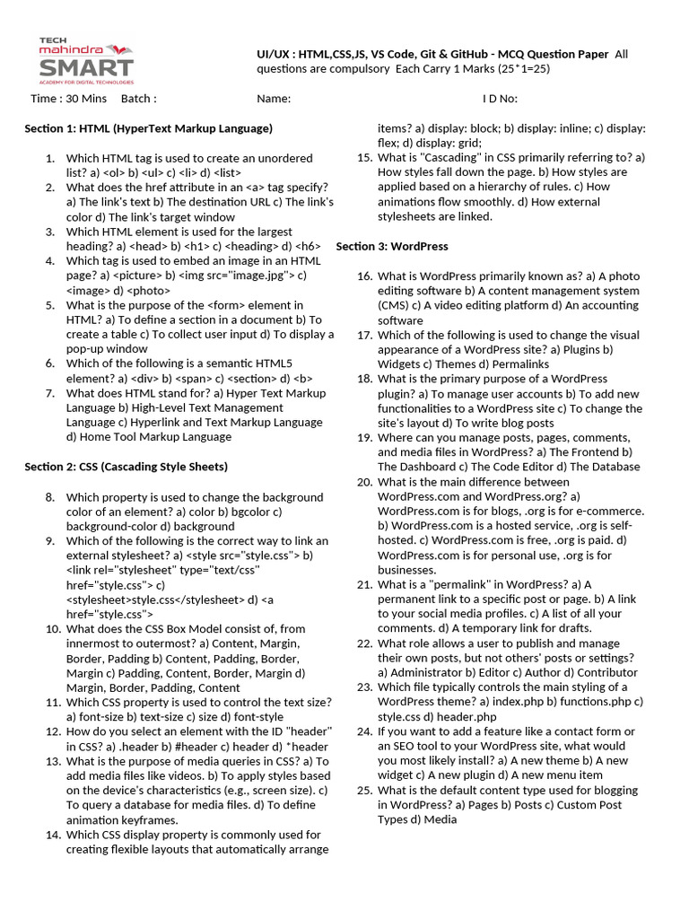 UI/UX : HTML,CSS,JS, VS Code, Git & GitHub - MCQ Question Paper All