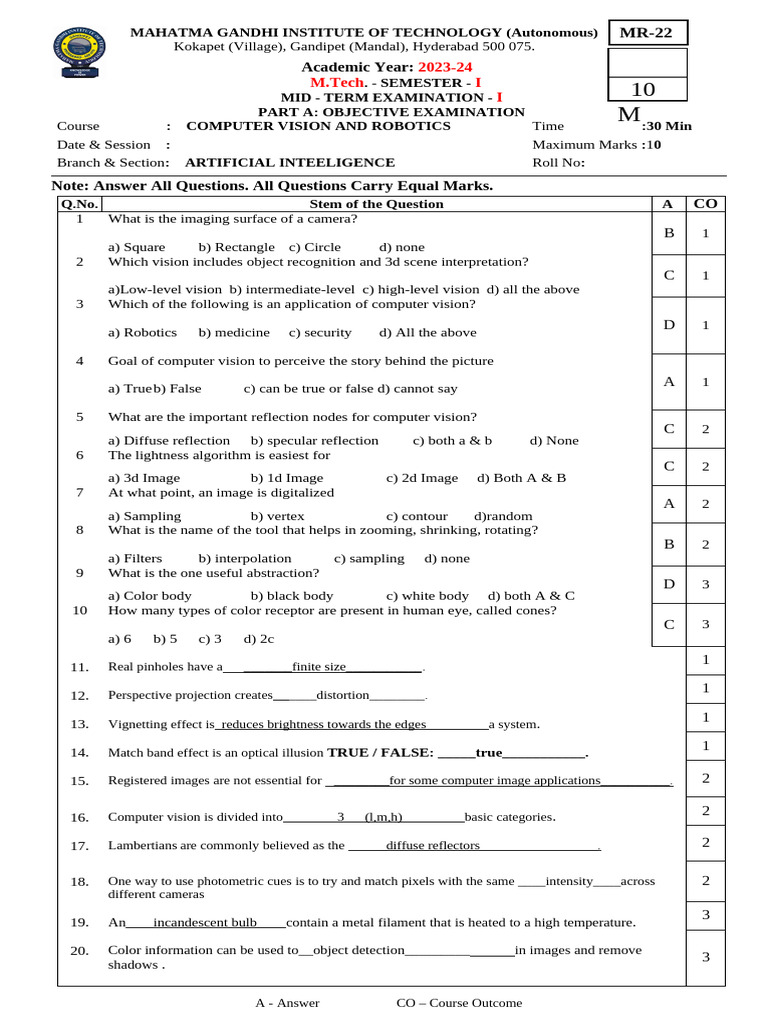 : COMPUTER VISION AND ROBOTICS Time :30 Min