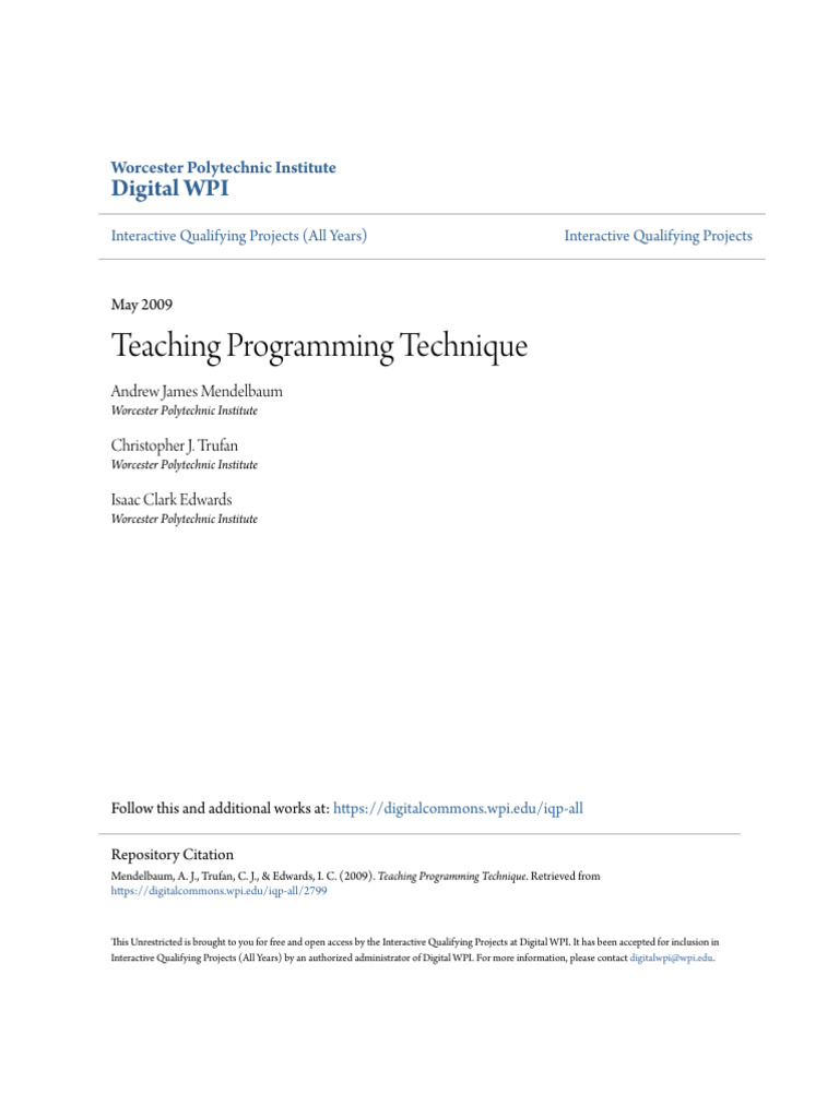 Mendelbaum, A. J., Trufan, C. J., & Edwards, I. C. (2009). Teaching Programming Technique. Retrieved from
