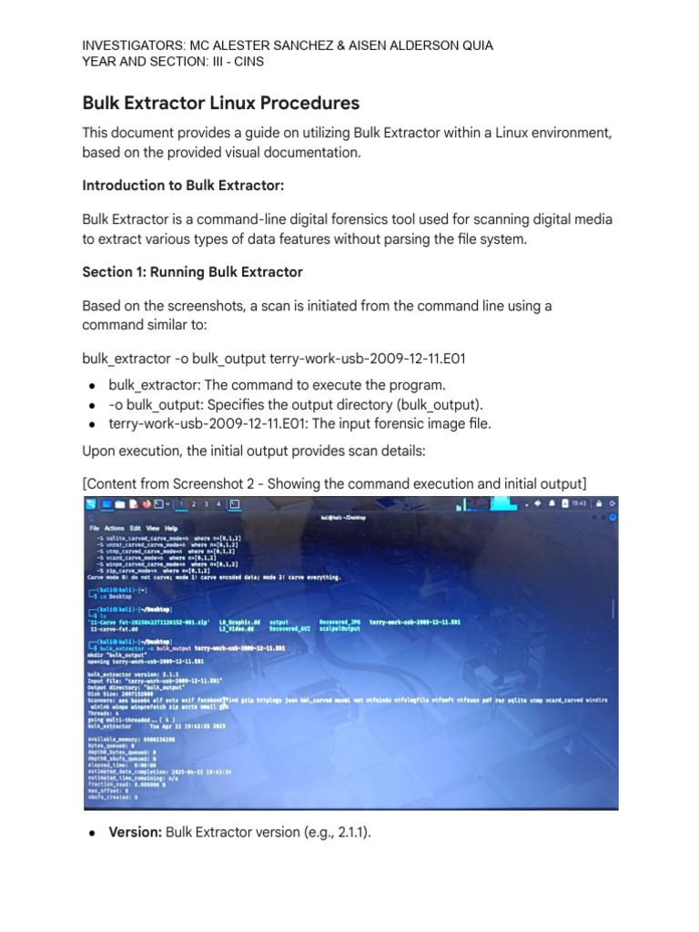 This document provides a guide on utilizing Bulk Extractor within a Linux environment,
