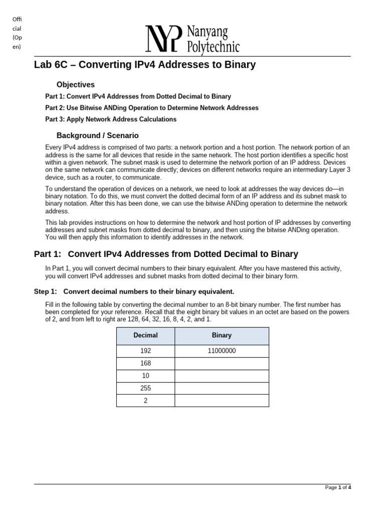 Part 1: Convert IPv4 Addresses from Dotted Decimal to Binary