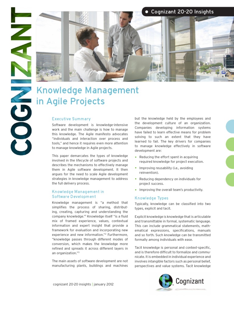 well if the teams are distributed. To address this, Agile teams should not only rely on the knowledge sharing through tacit knowledge but should also employ lightweight explicit knowledge sharing like test-driven development, needy documentation, usage of Wikis, and the discipline of capturing the learns through retrospectives.