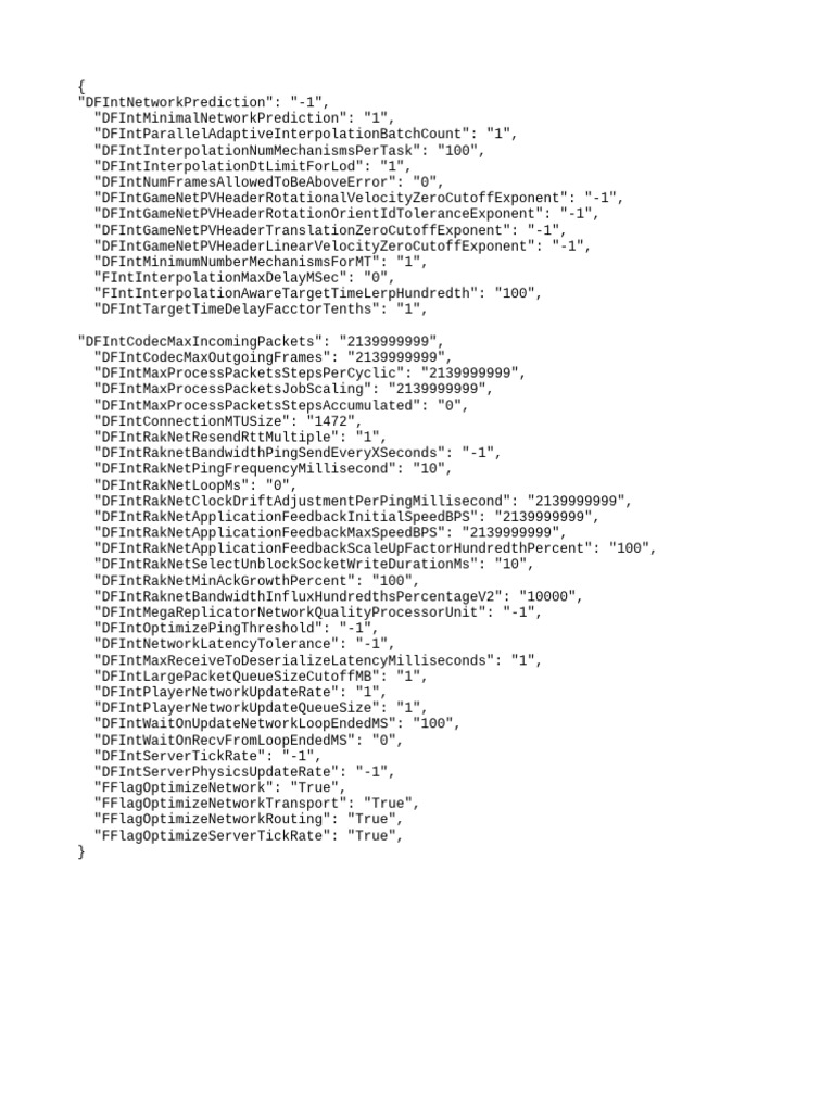 The document contains configuration settings for network prediction and optimization parameters, including limits on incoming packets, outgoing frames, and various latency thresholds. It also specifies flags for optimizing network transport, routing, and server tick rates. The values indicate a focus on maximizing performance and efficiency in network operations.