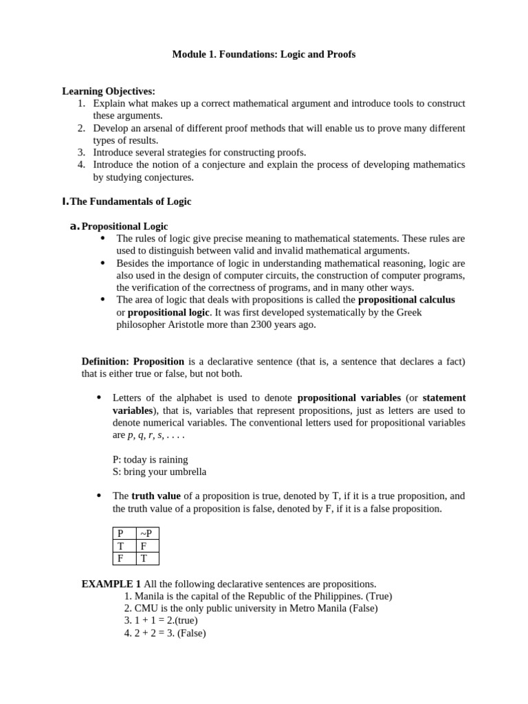 1. Explain what makes up a correct mathematical argument and introduce tools to construct