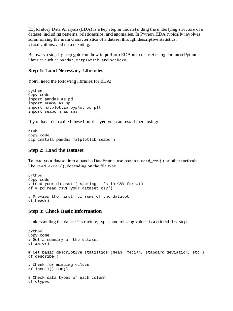 dataset, including patterns, relationships, and anomalies. In Python, EDA typically involves