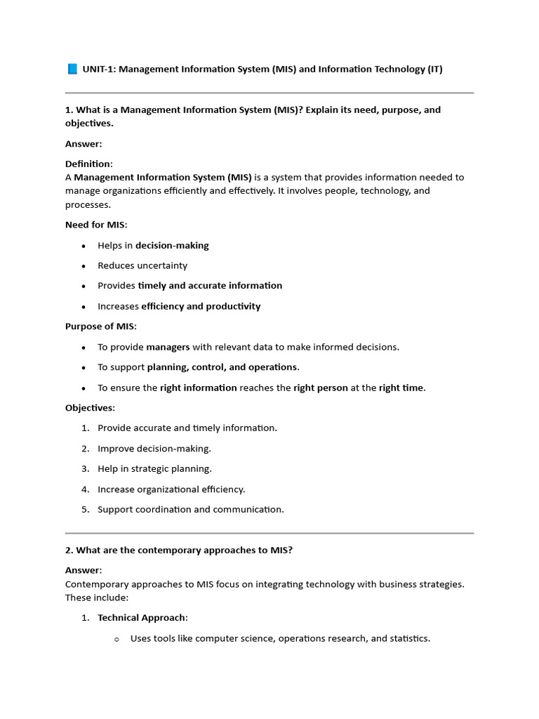 1. What is a Management Information System (MIS)? Explain its need, purpose, and