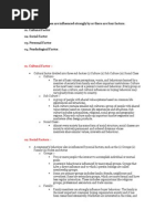 Cultural factor divided into three sub factors (i) Culture (ii) Sub Culture (iii) Social Class o Culture: The set of basic values perceptions, wants, and behaviors learned by a member of society from family and other important institutions. Culture is the most basic cause of a persons wants and behavior. Every group or society has a culture, and cultural influences on buying behavior may vary greatly from country to country. o Sub Culture : A group of people with shared value systems based on common life experiences and situations. Each culture contains smaller sub cultures a group of people with shared value system based on common life experiences and situations. Sub culture includes nationalities, religions, racial group and geographic regions. Many sub culture make up important market segments and marketers often design products.