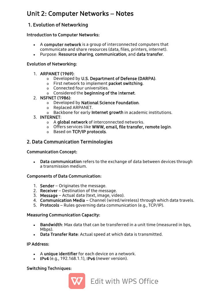 1. Circuit Switching – Dedicated path (e.g., Telephone calls).
