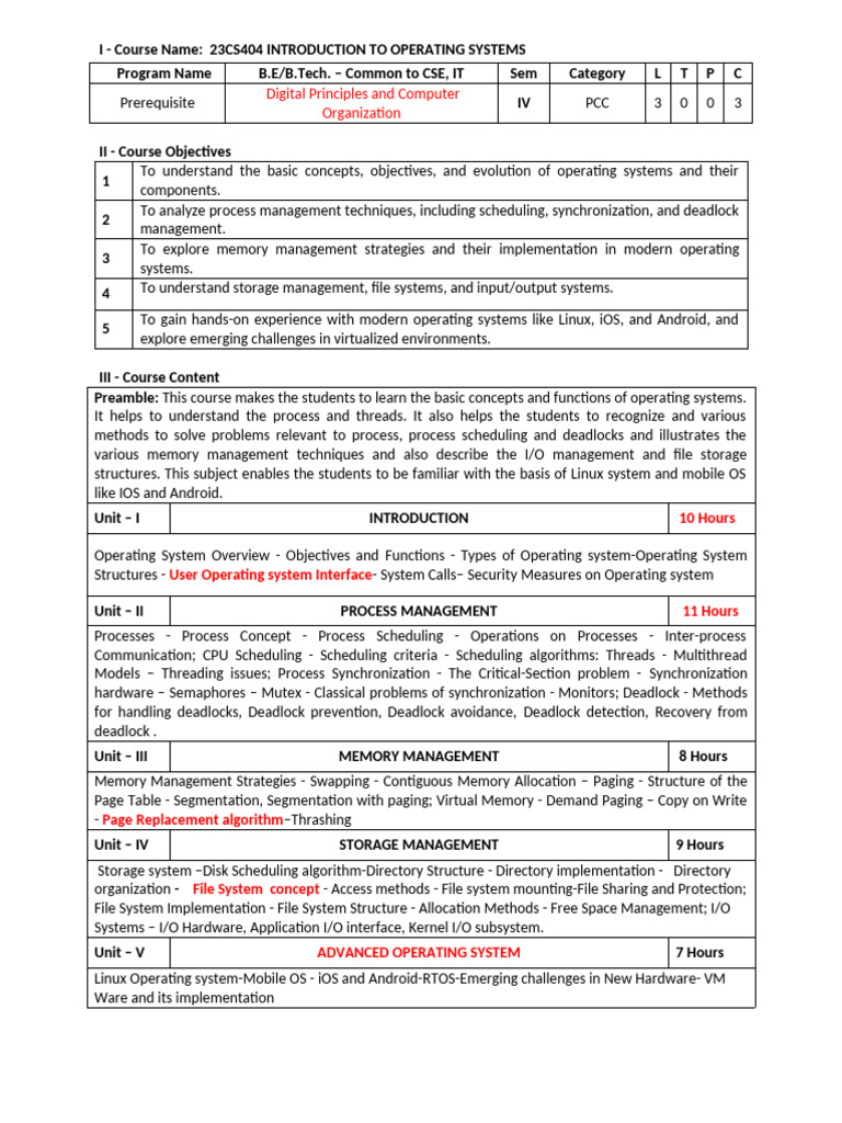 I - Course Name: 23CS404 INTRODUCTION TO OPERATING SYSTEMS