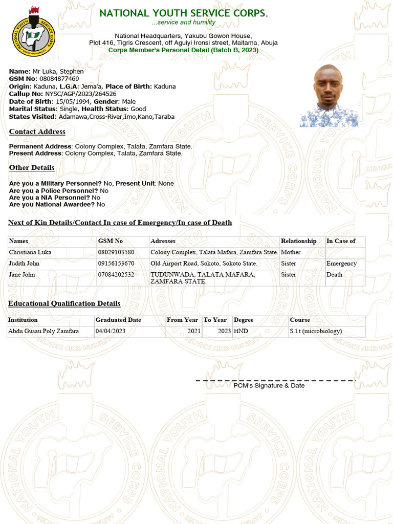 Permanent Address: Colony Complex, Talata, Zamfara State.