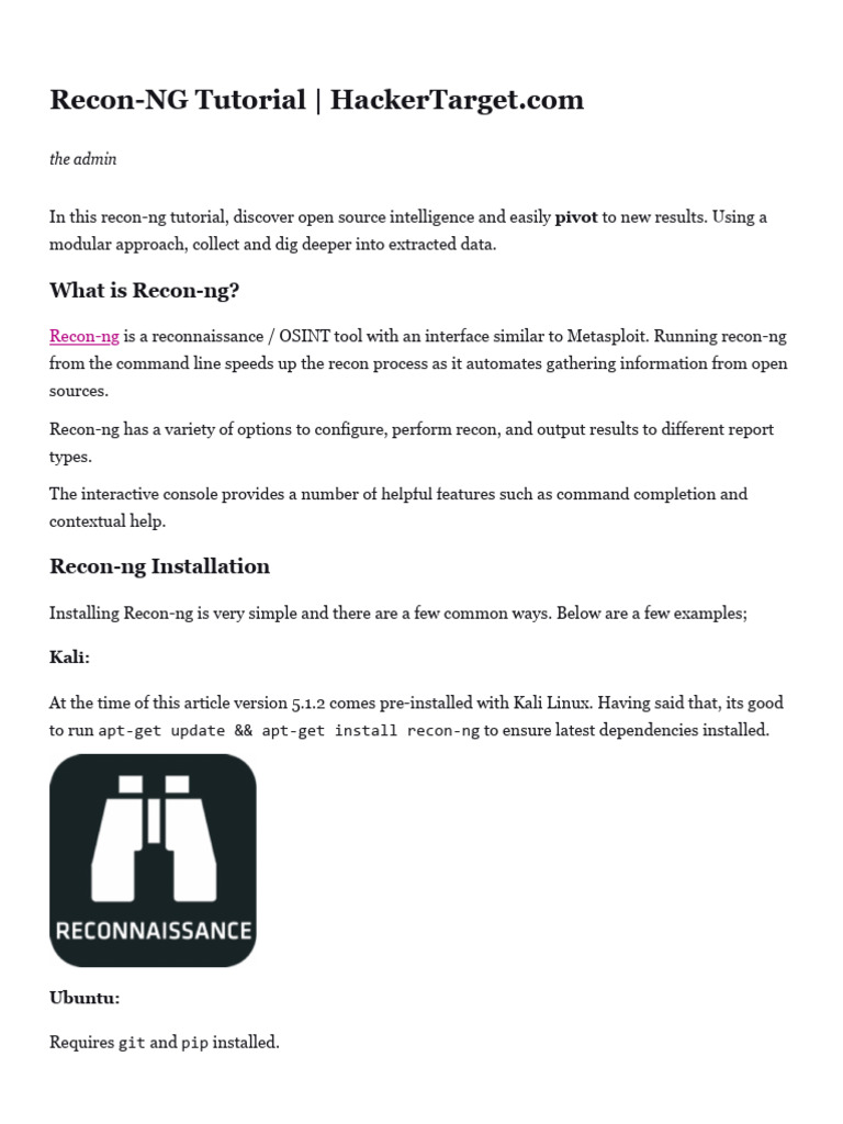 Installing Recon-ng is very simple and there are a few common ways. Below are a few examples;