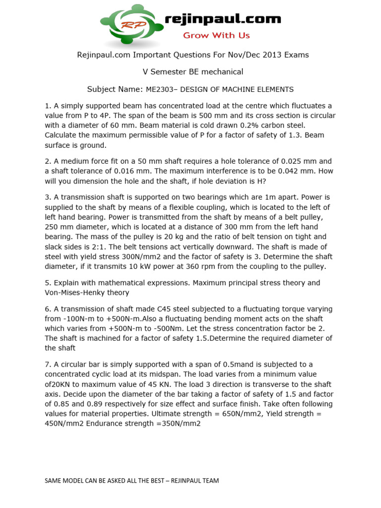 Subject Name: ME2303– DESIGN OF MACHINE ELEMENTS
