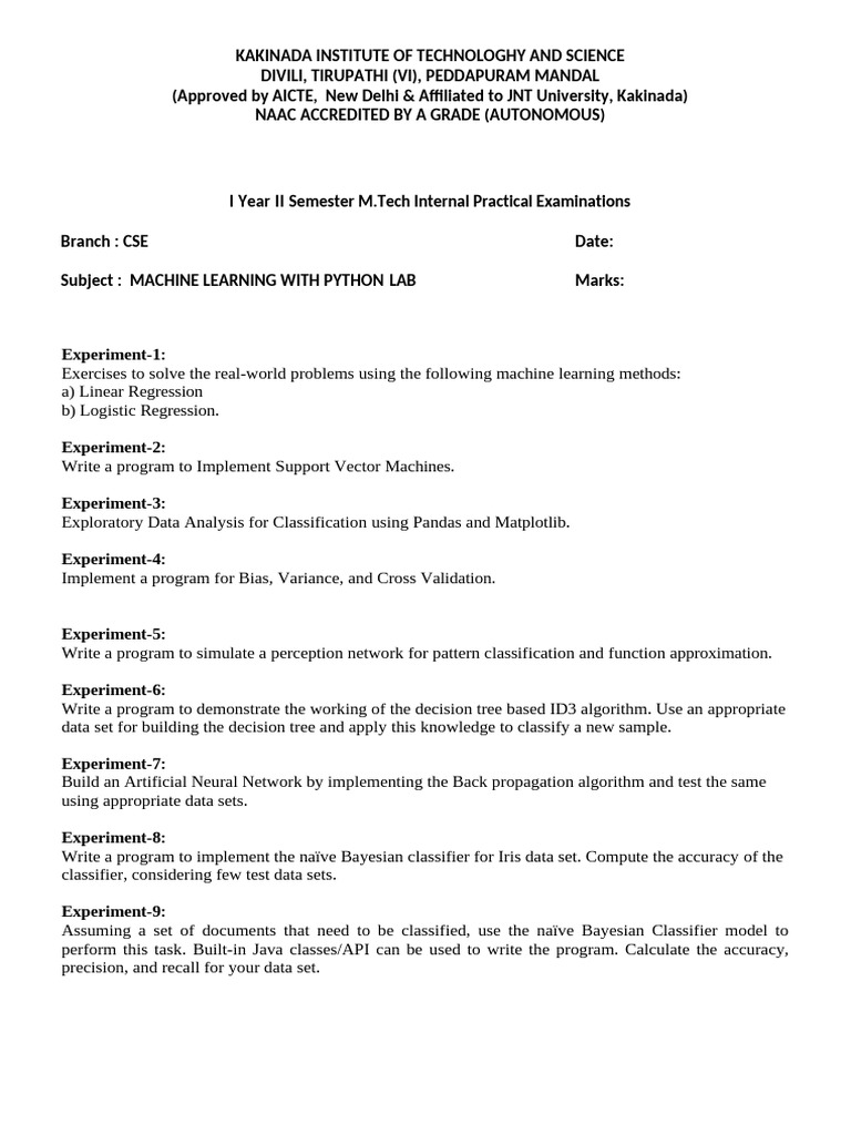 Subject : MACHINE LEARNING WITH PYTHON LAB Marks:
