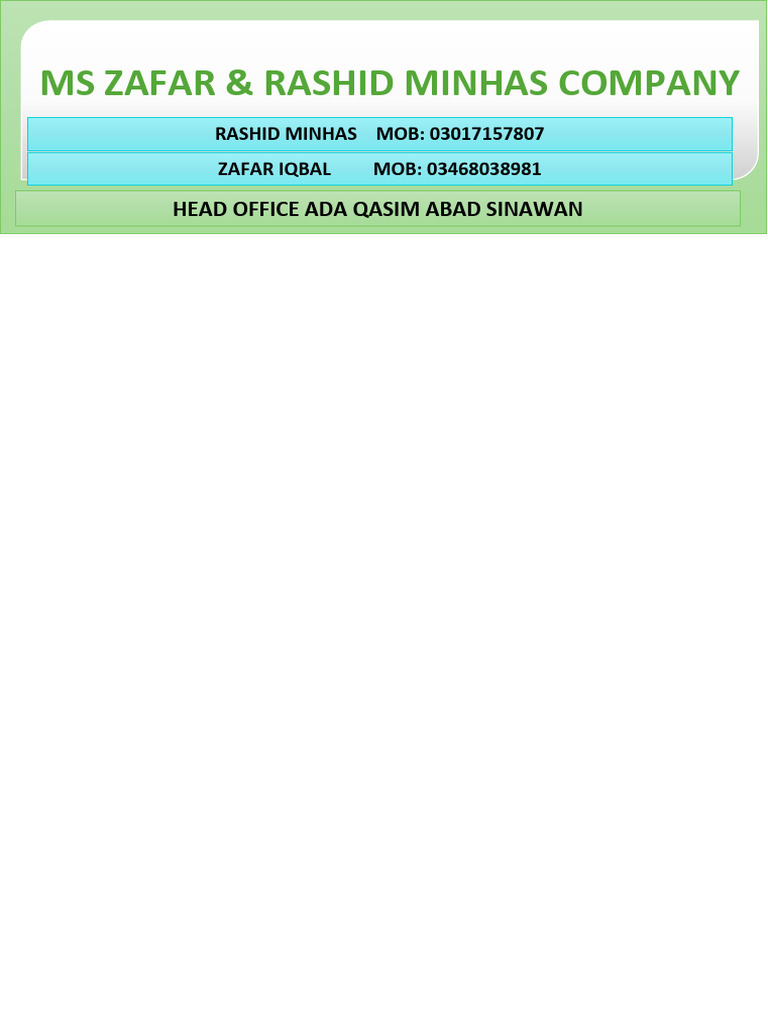 The document provides contact information for MS Zafar & Rashid Minhas Company. It includes the names of two individuals, Rashid Minhas and Zafar Iqbal, along with their mobile numbers. The head office is located in Ada Qasim Abad Sinawan.