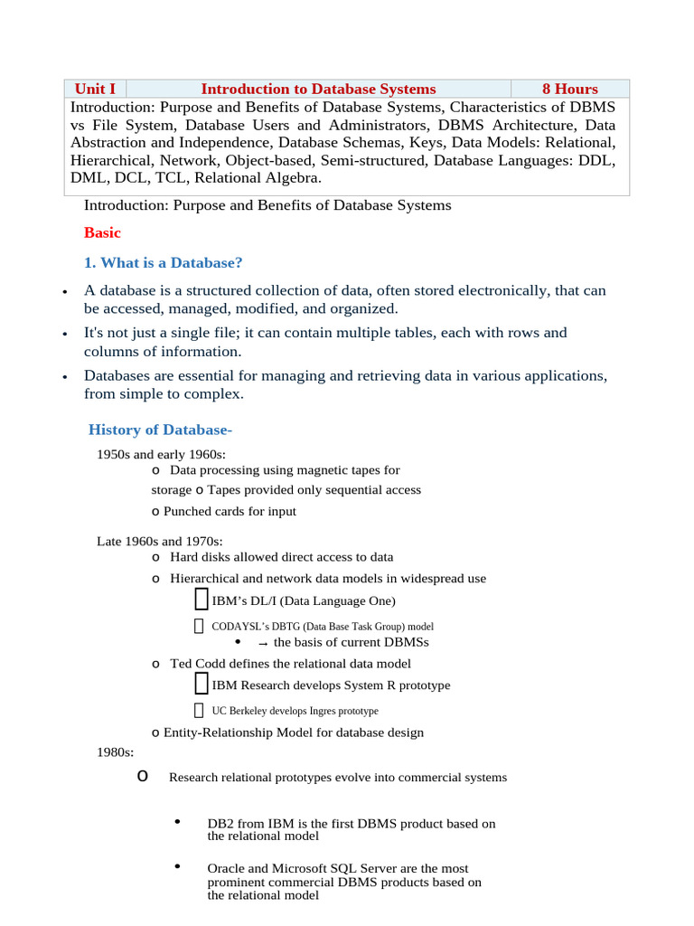 Unit I Introduction to Database Systems 8 Hours