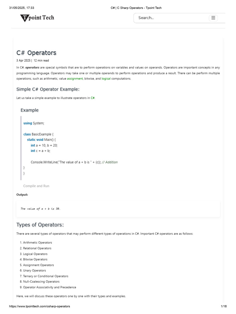 31/05/2025, 17:33 C# | C Sharp Operators - Tpoint Tech