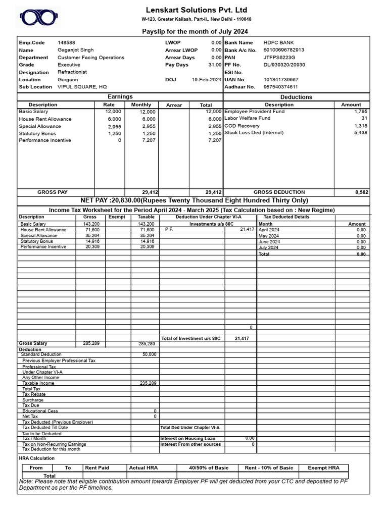 House Rent Allowance 71,600 71,600 P F. 21,417 April 2024 0.00