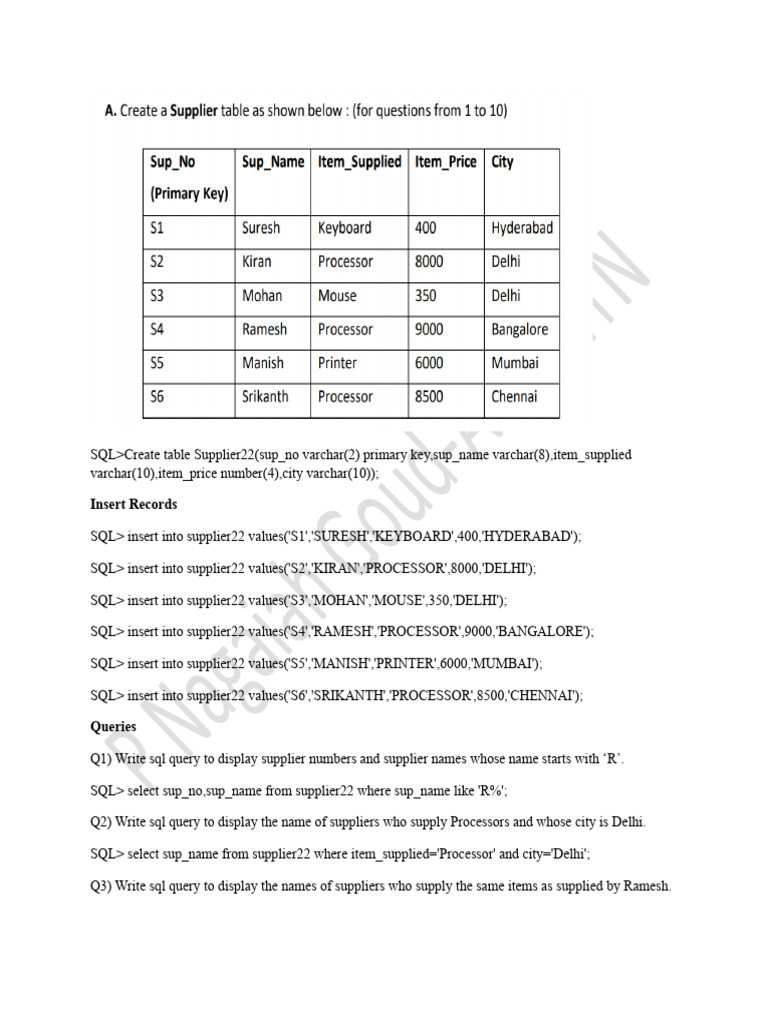 SQL>Create table Supplier22(sup_no varchar(2) primary key,sup_name varchar(8),item_supplied