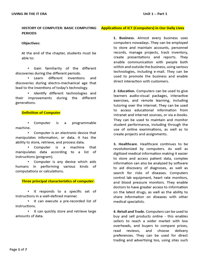 HISTORY OF COMPUTER: BASIC COMPUTING Applications of ICT (Computers) in Our Daily Lives