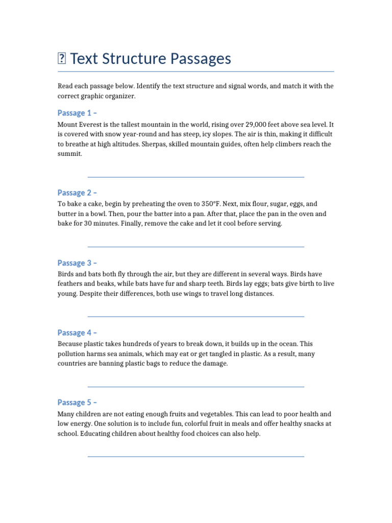 Read each passage below. Identify the text structure and signal words, and match it with the