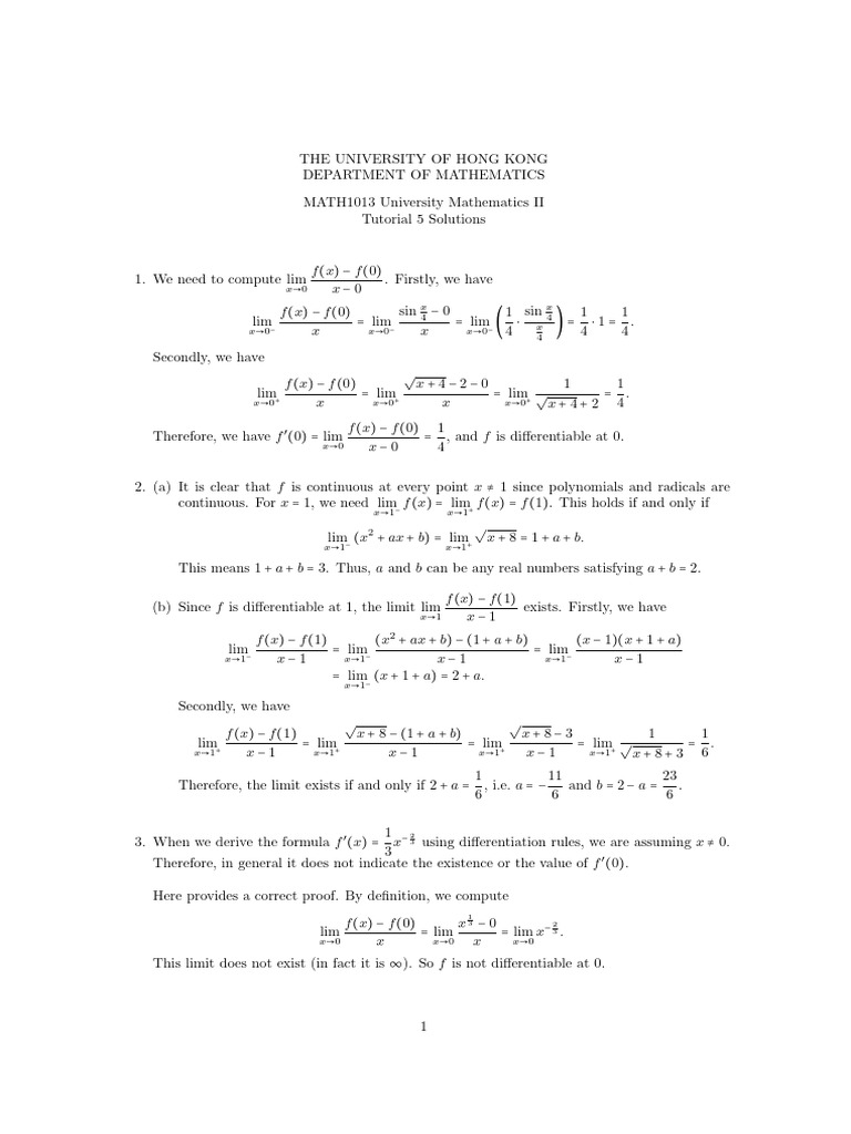 (b) Since f is differentiable at 1, the limit lim exists. Firstly, we have