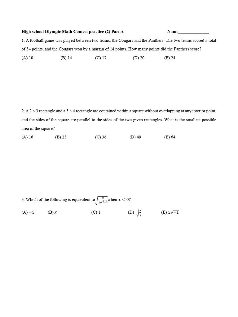 High school Olympic Math Contest practice (2) Part A Name______________