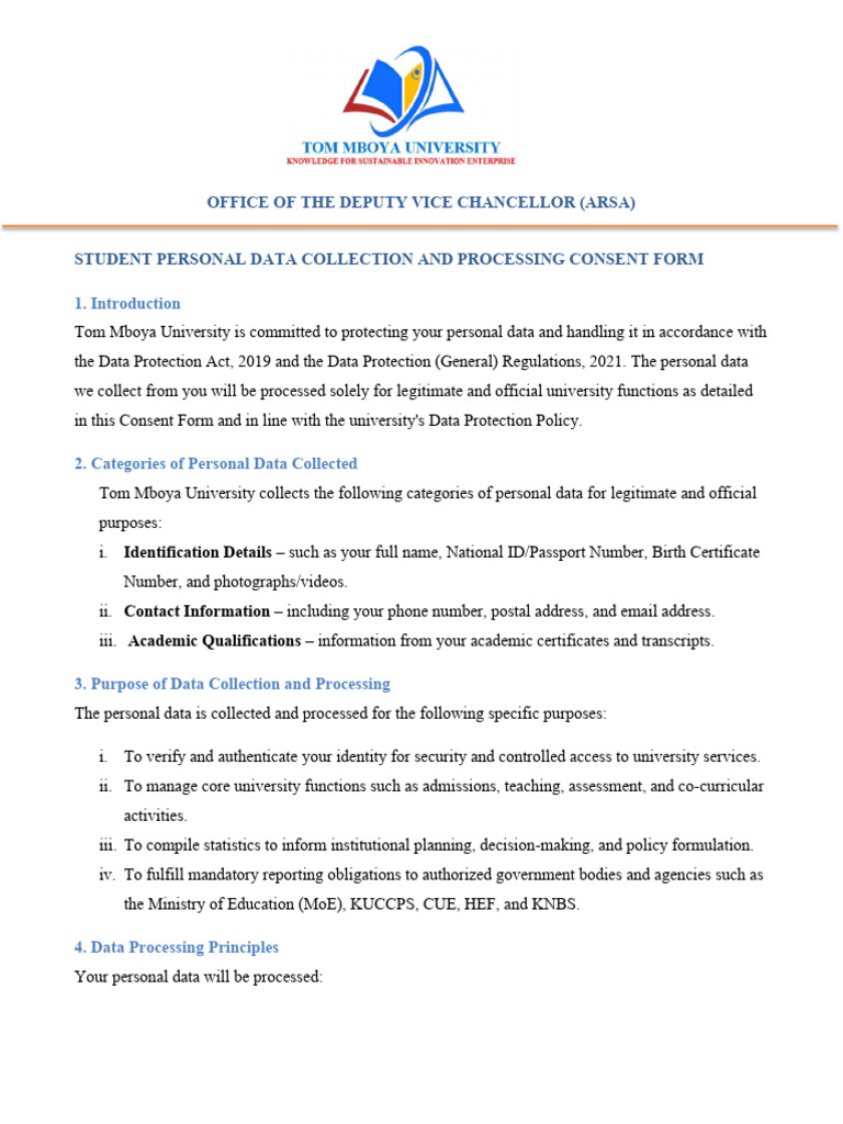 Tom Mboya University is committed to protecting your personal data and handling it in accordance with