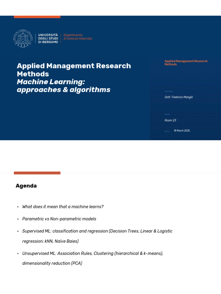 • Supervised ML: classification and regression (Decision Trees, Linear & Logistic