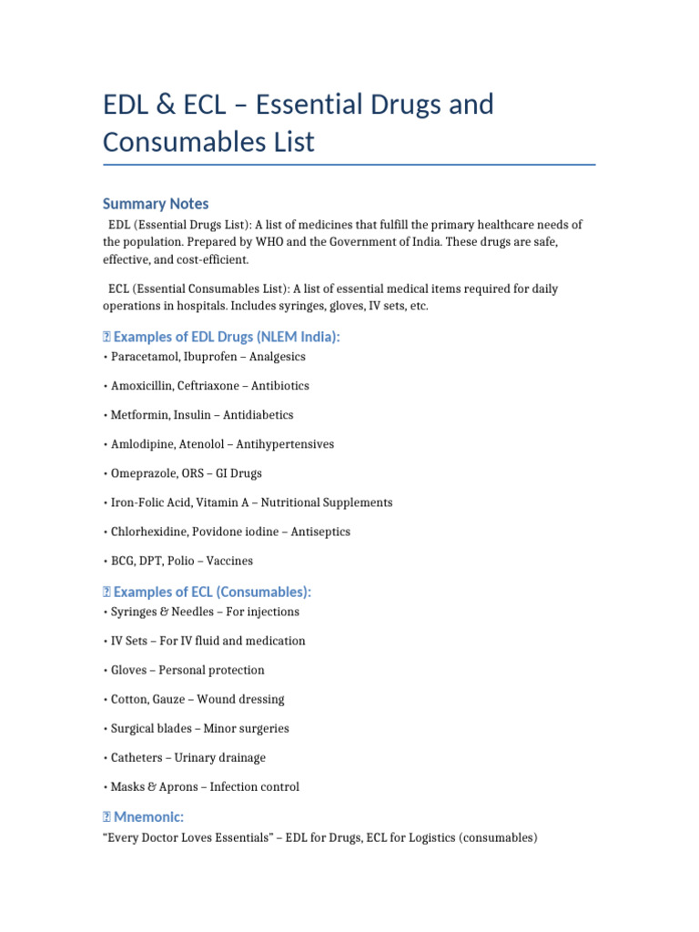 “Every Doctor Loves Essentials” – EDL for Drugs, ECL for Logistics (consumables)