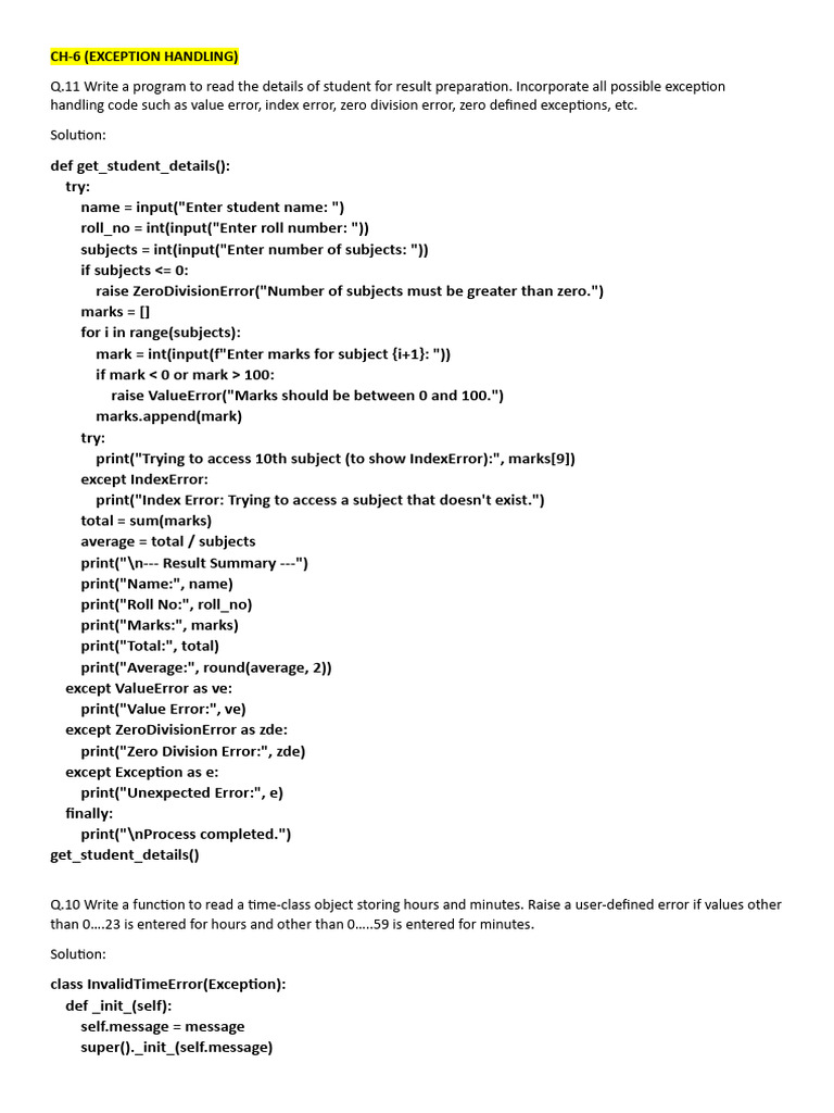 Q.11 Write a program to read the details of student for result preparation. Incorporate all possible exception