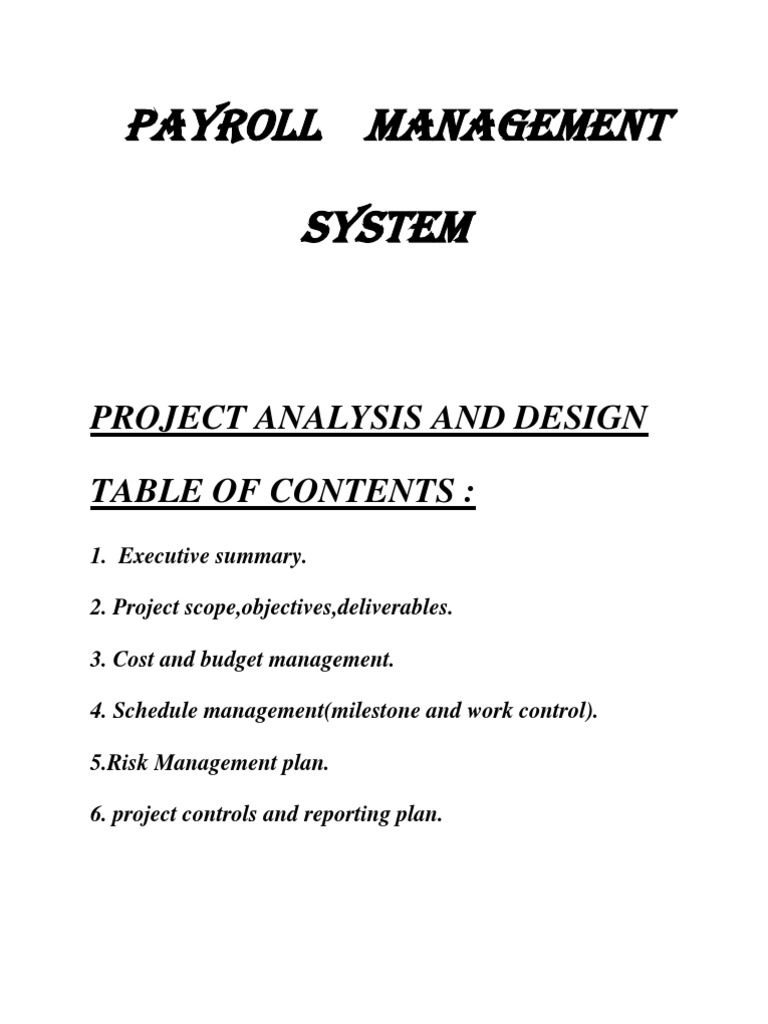 1. Executive summary. 2. Project scope,objectives,deliverables. 3. Cost and budget management. 4. Schedule management(milestone and work control). 5.Risk Management plan. 6. project controls and reporting plan.