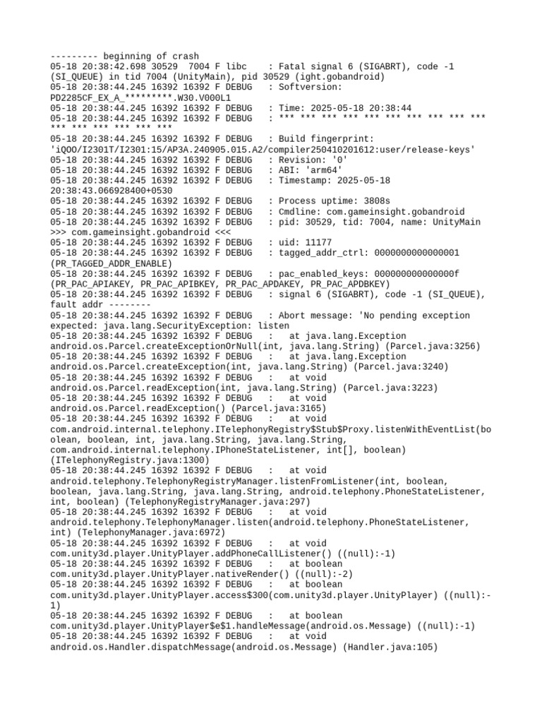 05-18 20:38:44.245 16392 16392 F DEBUG : pid: 30529, tid: 7004, name: UnityMain
