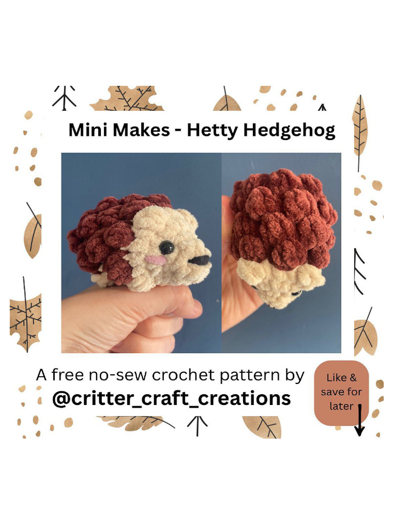 This document provides a free no-sew crochet pattern for making a Hetty Hedgehog using super chunky weight yarn and a 5mm crochet hook. It includes a list of materials, abbreviations, and step-by-step instructions for creating the hedgehog. The pattern is the property of Critter Craft Creations and cannot be copied or sold.