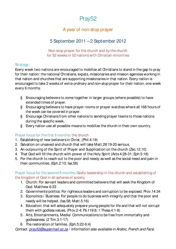 Non-stop prayer for the church and by the church for 52 weeks in 52 nations with Christian minorities Strategy: Every week two nations are encouraged to mobilize all Christians to stand in the gap to pray for their nation: the national Christians, expats, missionaries and mission agencies working in that nation and churches that are supporting missionaries in that nation. Every nation is encouraged to take 2 weeks of extra-ordinary and non-stop prayer for their nation, one week every 6 months. Encouraging believers to come together in larger groups (where possible) to have extended times of prayer. Encouraging believers to have prayer rooms or prayer watches where all 168 hours of the week can be covered in prayer. Encourage Christians from other nations to sending prayer teams to those nations during the specific week. Every nation use all possible means to mobilize the church in their own country. Prayer focus for the first 6 months: the church 1. Establishing of new believers in Christ. (Phil.4:19) 2. Salvation on unsaved and church that will take Matt.28:19-20 serious. 3. An outpouring of the Spirit of Prayer and Supplication on the church (Zec.12:10) 4. That God will fill the church with power of the Holy Spirit (Acts 4:28-31; Eph.5:18) 5. For the church to reach out to the poor and needy as well as the social need and pain in their communities. (Eph.2:10; Isa.58) Prayer focus for the second 6 months: Godly leadership in the church and establishing of the kingdom of God in all spheres of society 1. Church: For servant leaders and committed believers that will seek the Kingdom of God. Matthew 6:33 2. Governments/politics: For righteous leaders and corruption to be exposed. Prov.14:34 3. Economics / Business: For people to do business with integrity and that the poor and needy will be helped. (Isa.58; Matt.5:16) 4. Education: that will adequately prepare young people for life and that will not corrupt them with godless values. (Prov.2-4; Ps.119:8; 1 Thess.4:1-8) 5. Arts, Entertainments, Media/ Communications to be free from immortality and godlessness. (2 Tim.3:1-17) 6. The restoration of families. (Eph.5:22-6:4) Contact: pray52@supermail.co.za / Information also available in Arabic, French and Farsi.