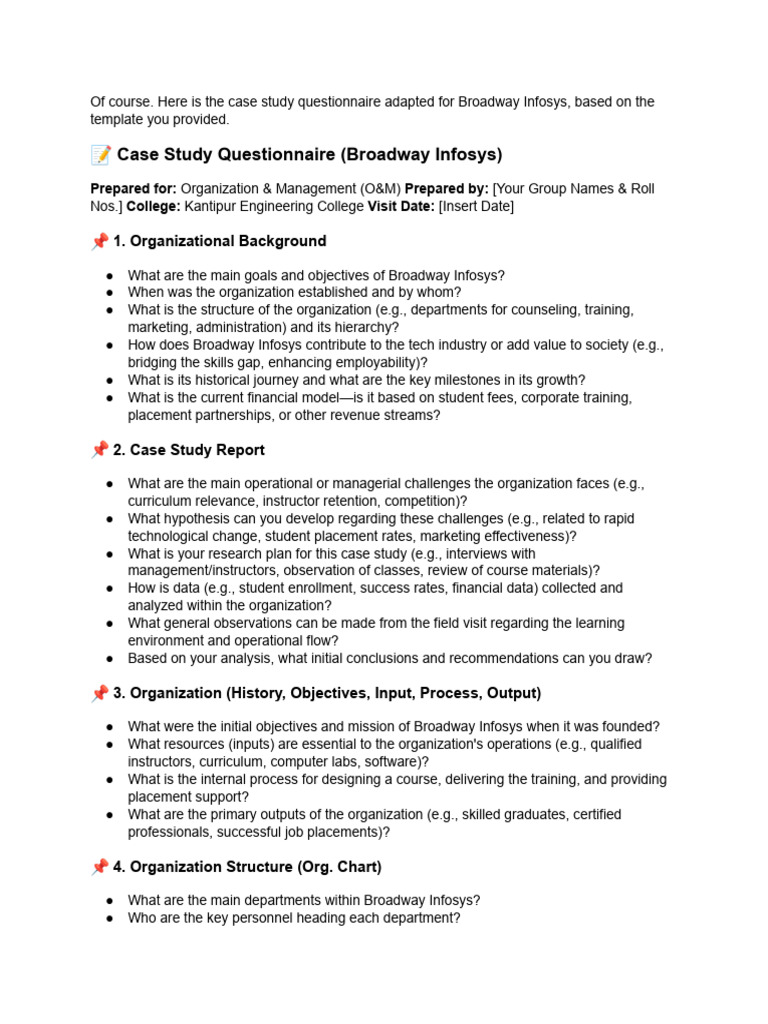 Here is the case study questionnaire adapted for Broadway Infosys, based on the
