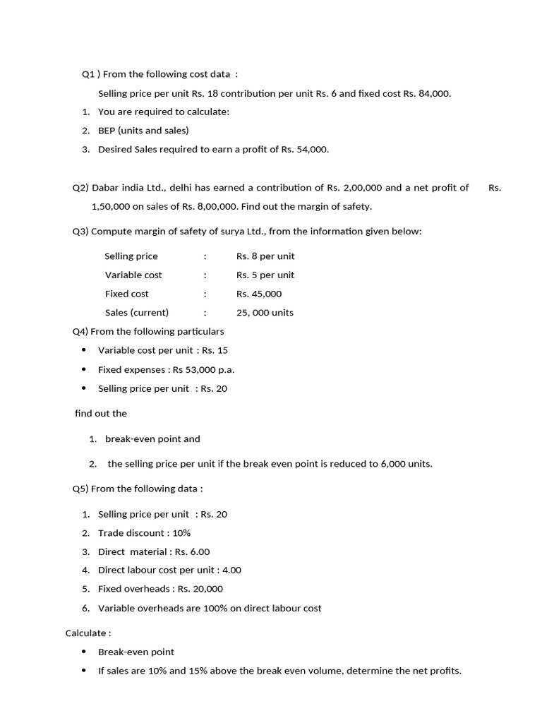 Selling price per unit Rs. 18 contribution per unit Rs. 6 and fixed cost Rs. 84,000.
