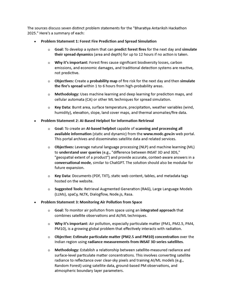 The sources discuss seven distinct problem statements for the "Bharatiya Antariksh Hackathon
